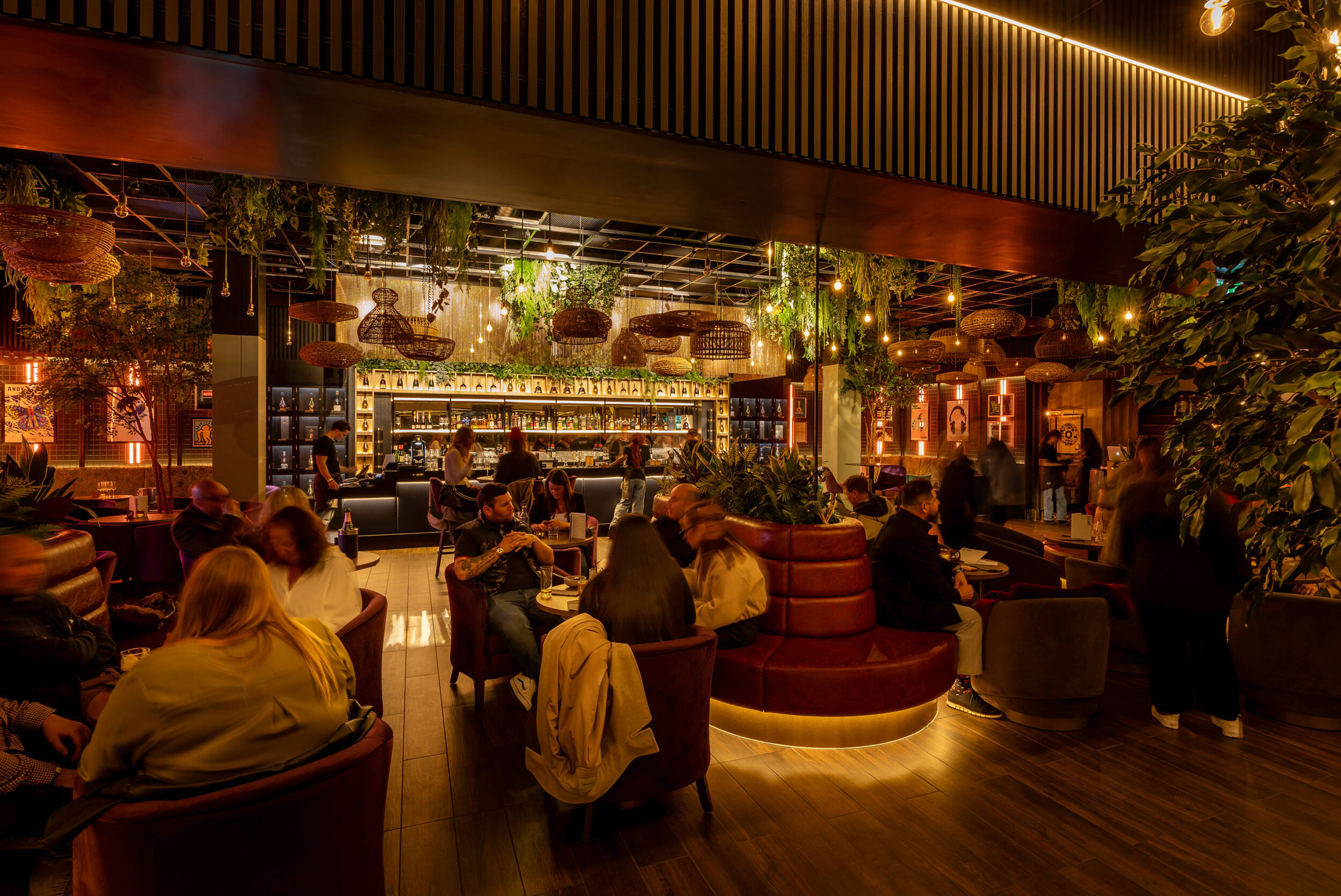 – The Atrium on the ground floor is the vibrant heart of the building pre-event. Upon arrival, fans walk through a darkened foyer as they descend to the atrium floor, where the double-height space reveals itself. A flexible gathering space, the atrium is designed to transform into an events space. It features a 26m-long bar, two theatre cooking markets, one grab and go market, merchandise – all the necessary amenities to offer a space for visitors to rejoin afterwards.